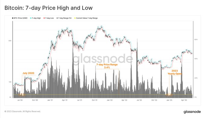 Elsewhere, according to onchain data provided by crypto analysis platform Glassnode, Bitcoin’s seven-day price range has been relatively tight at 3.4%. Comparisons to previous periods, such as January 2023 and July 2020, indicate that similar tight price ranges preceded significant market moves in the past. Therefore, the trend suggests high volatility is on the horizon.