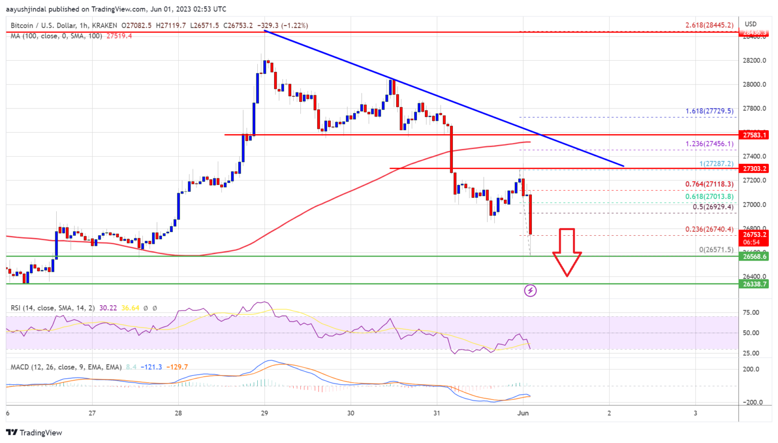 There was a clear move below the $27,400 level and the 100 hourly Simple moving average. The price even dived below the $27,000 level and traded close to the $26,500 support. A low is formed near $26,571 and the price is now consolidating losses.