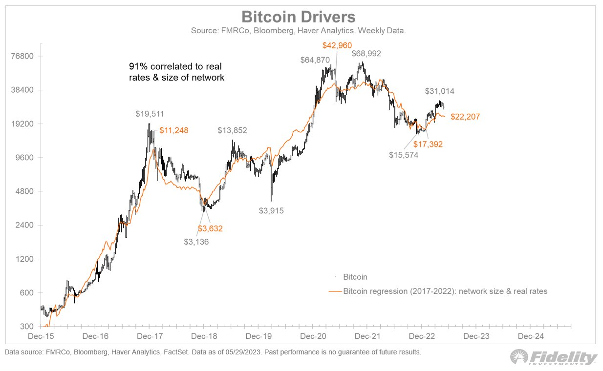 He presented a chart showing a regression of both the network and real rates, pointing out that since 2017, these two variables have a correlation of 91%. This suggests that Bitcoin’s network growth and the macro landscape, reflected by real rates, explain a significant portion of its price movement.