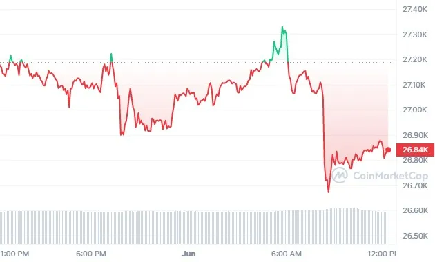 At press time, BTC price is trading at $26,841.55 with a 24-hour trading volume of $15.25 Billion. The most-traded cryptocurrency by market cap is down 1.15% in the last 24 hours while having a current market cap of $520.44 Billion. As per the data, sourced from CoinMarketCap, the coin noted low at $26,671.72 while high was at $27,346.11.