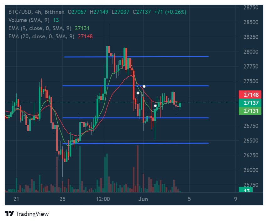 Should BTC close a 4-hour candle above the 9 and 20 EMA lines within the following 12 hours, its price will most likely attempt to flip the $27,423 resistance level into support in the next 48 hours. Thereafter, BTC will have a clear path to climb towards the next major resistance level at $27,916.
