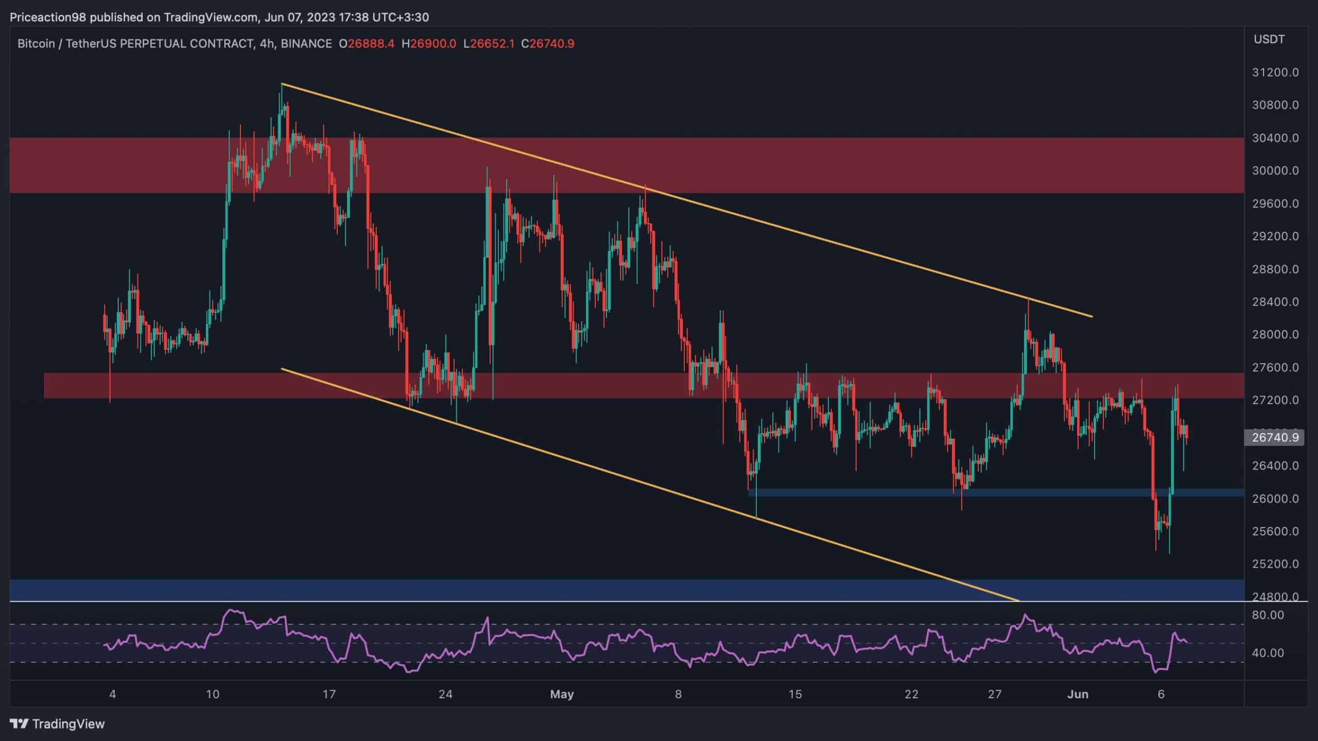 Looking at the 4-hour timeframe, it is clear that the Bitcoin price faced a significant barrier at the $27,500 resistance level and experienced a sharp decline thereafter. The short-term support level at $26K has also been breached, indicating a continued downward movement with strong momentum.