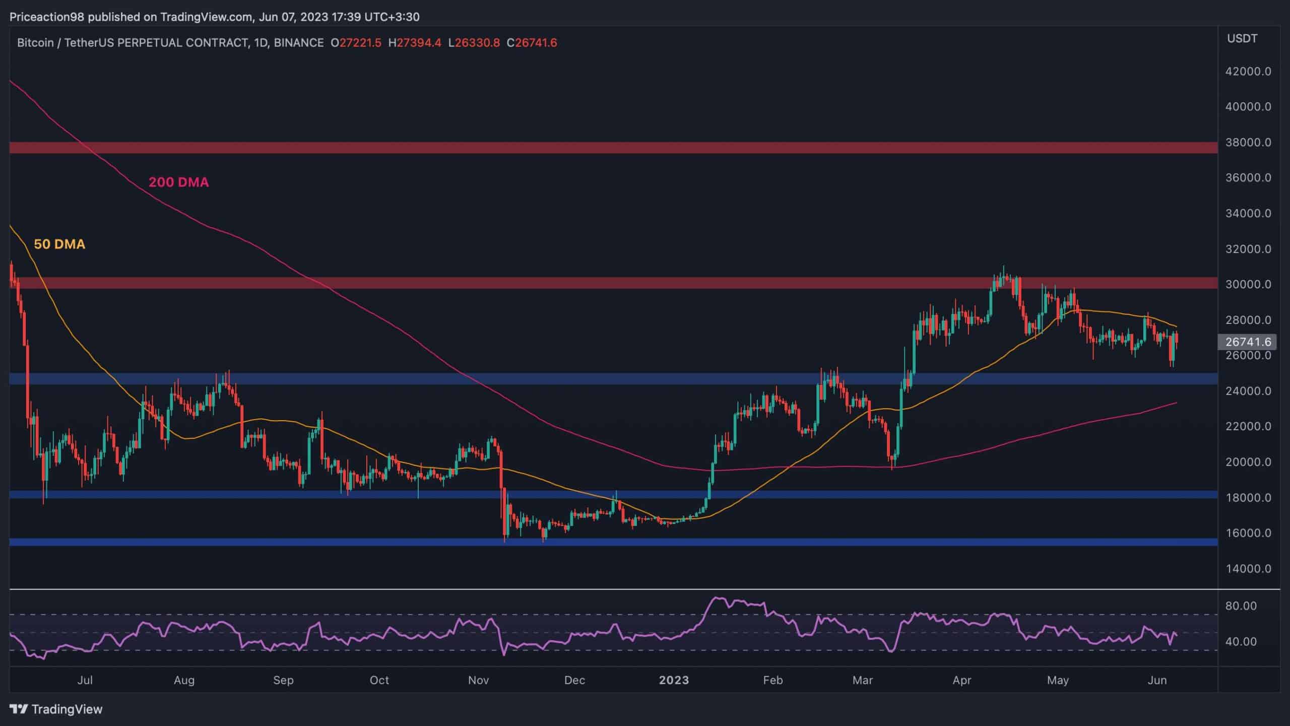 On the daily timeframe, the Bitcoin price has consistently formed lower highs and lows in the past couple of months. The 50-day moving average acted as a strong resistance, causing a downward rejection near the $28K level.