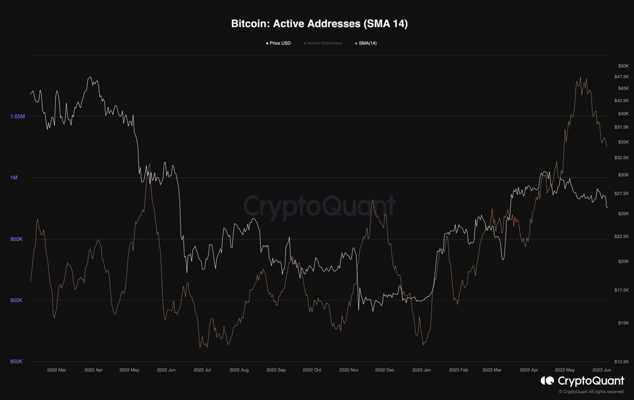 A graph representing the Active Addresses metric, which indicates the number of participants actively engaging with Bitcoin’s network alongside the price, provides valuable insights. The chart demonstrates an upward trend, signaling a positive outlook for network activity and the demand for Bitcoin.