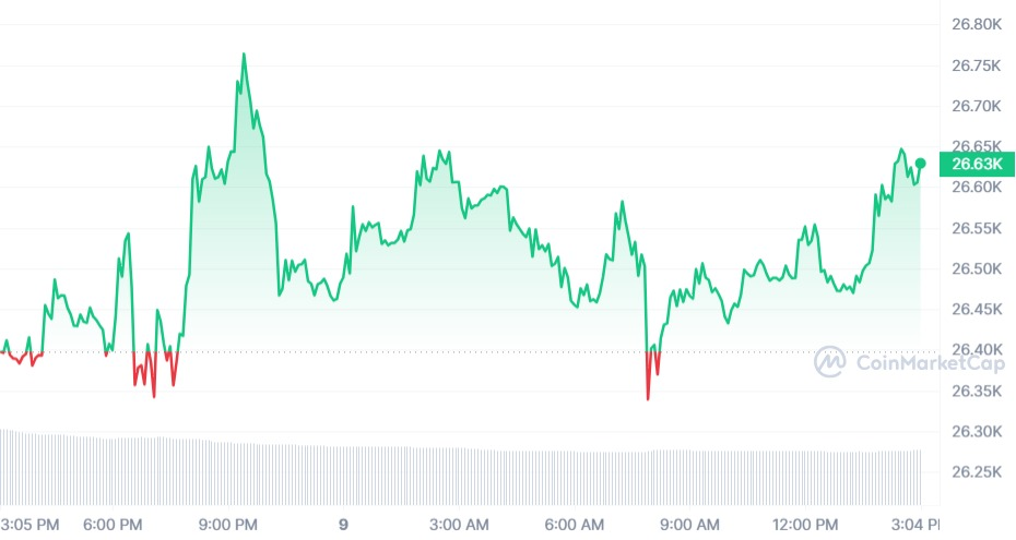 At the time of writing, the Bitcoin price remains $26,605.54, with a 24-hour trading volume of $12,085,120,778.