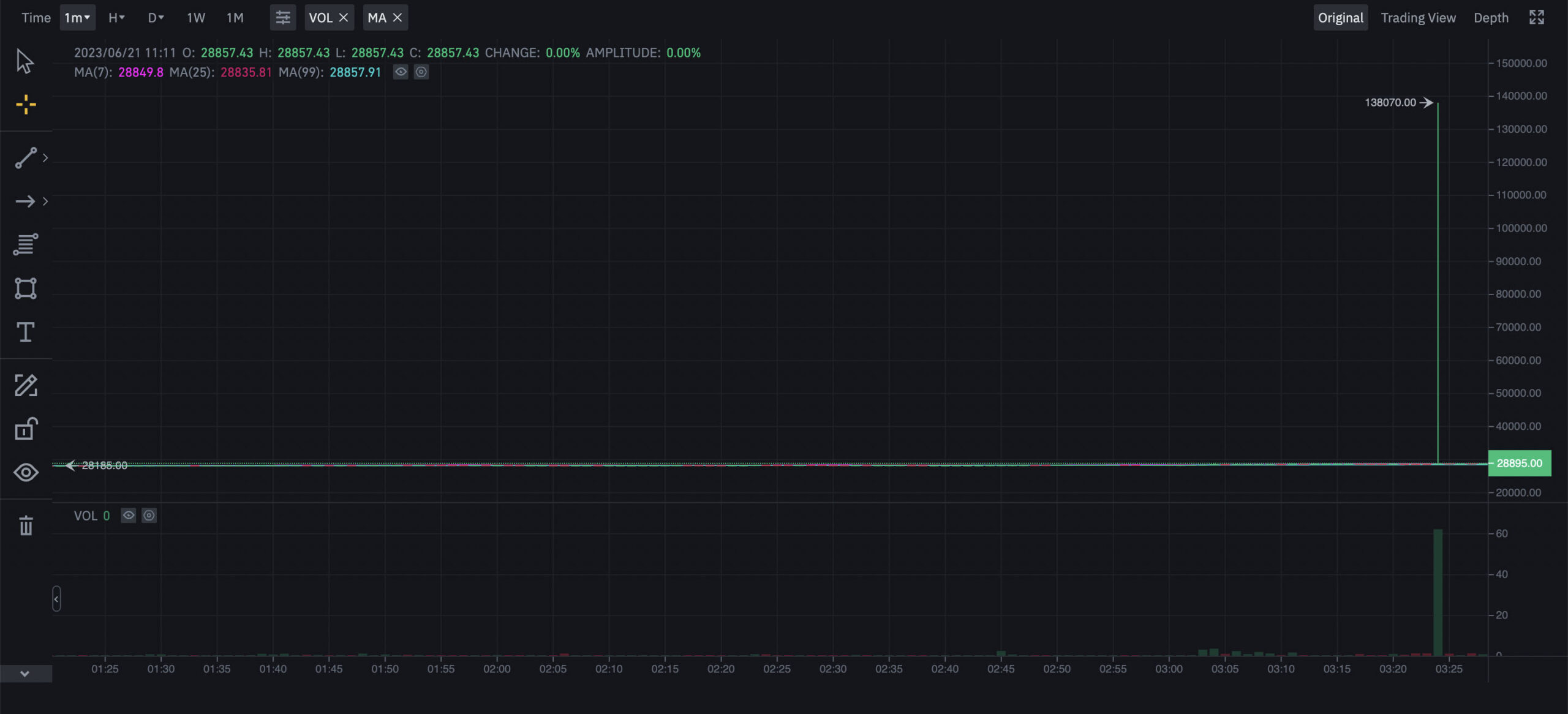 The sudden surge was only reported to have lasted for a few seconds, according to TradingView data reviewed by Blockworks.