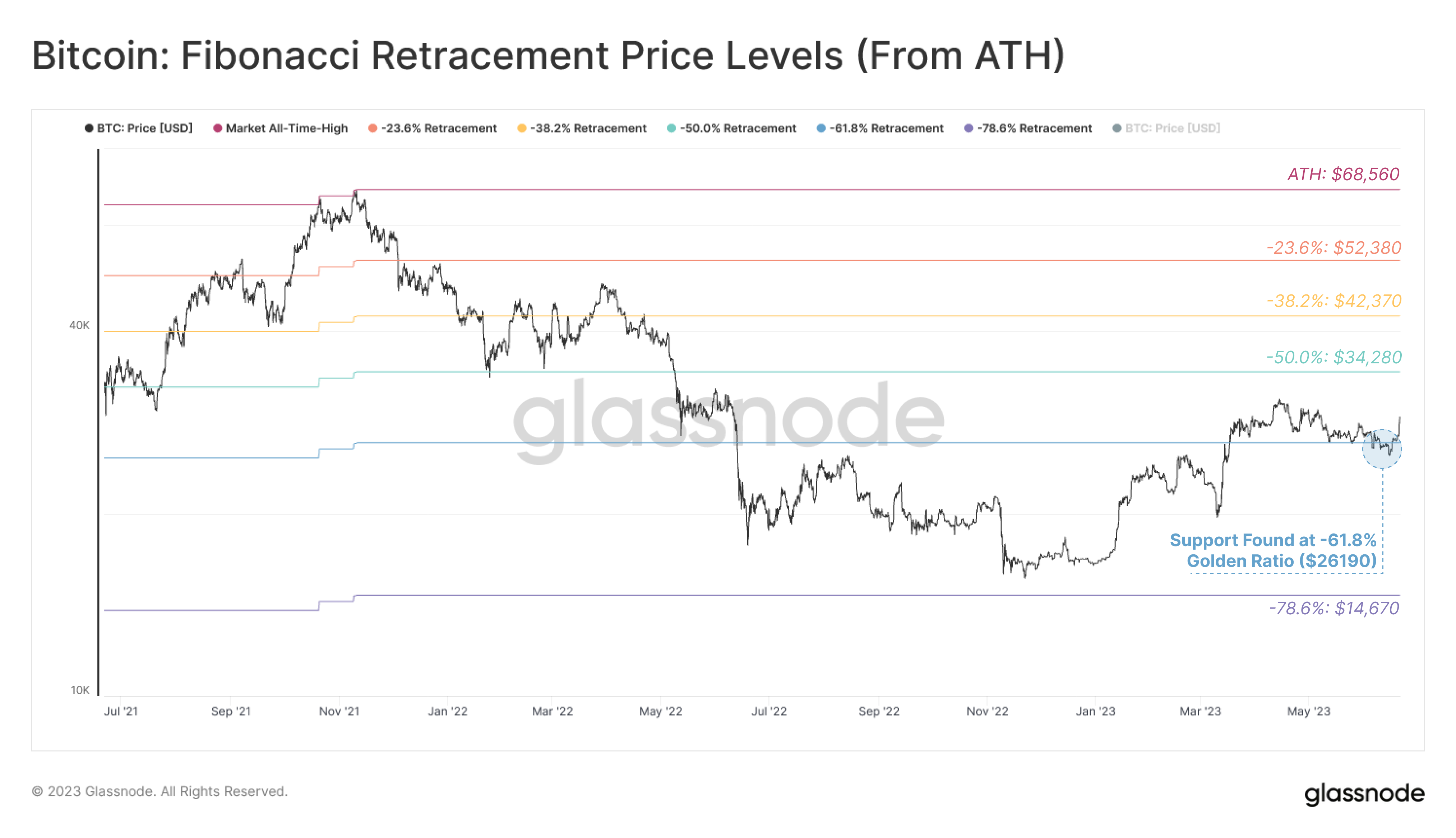Chart showing Bitcoin Fibonacci retracement levels from its all-time. Source: GlassnodeHaving survived the negative sentiment that surrounded the SEC’s crackdown, the current wave of buy pressure could bring two other major resistance areas into play.