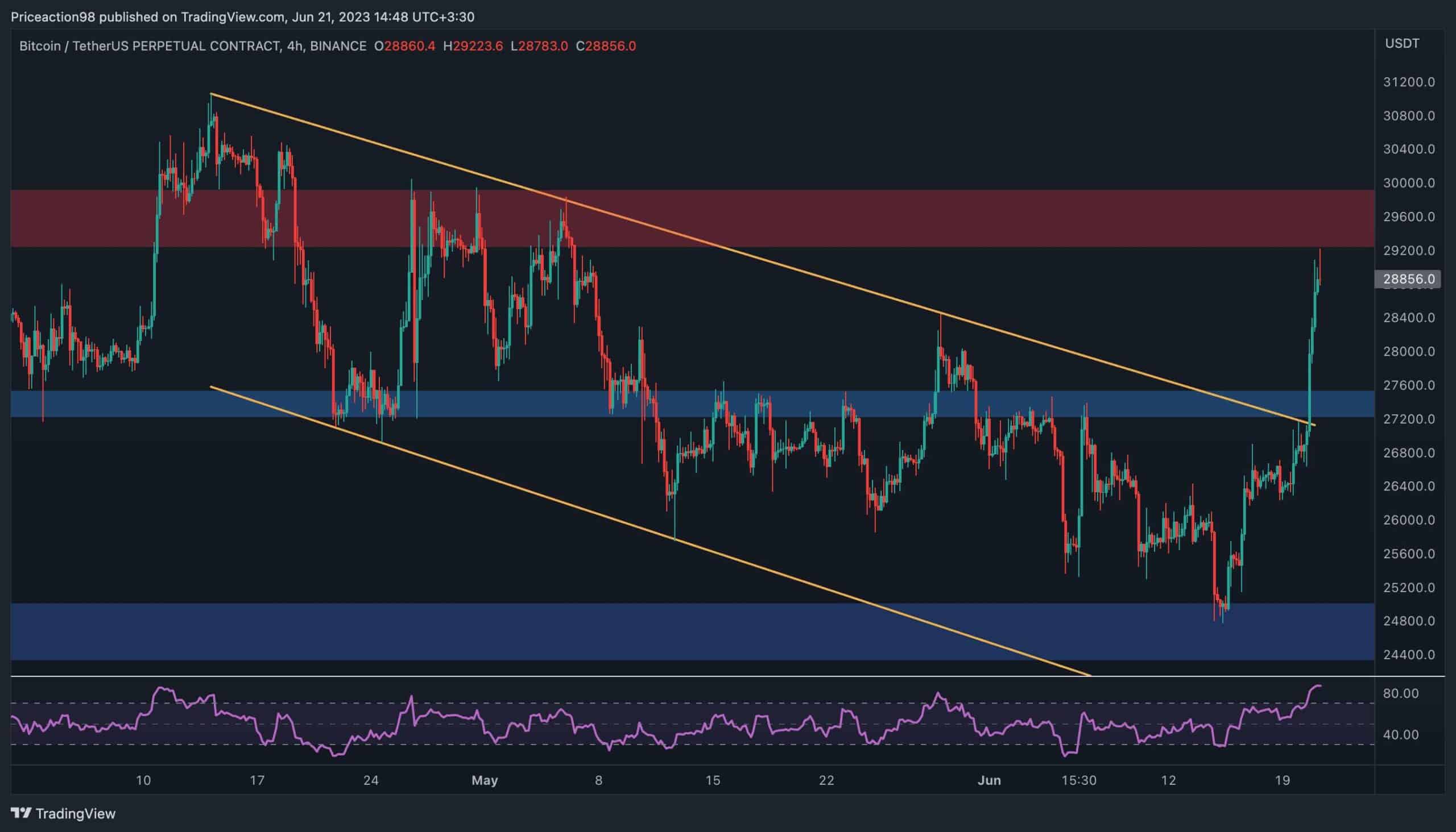 After facing rejection at the $30K resistance level in April, Bitcoin’s price has been gradually declining on the daily chart. However, a recent rebound from the $25K support level has sparked a continuous rally in the past few days. The price effortlessly surpassed the 50-day moving average at around $27K and is now approaching the $30K level again.