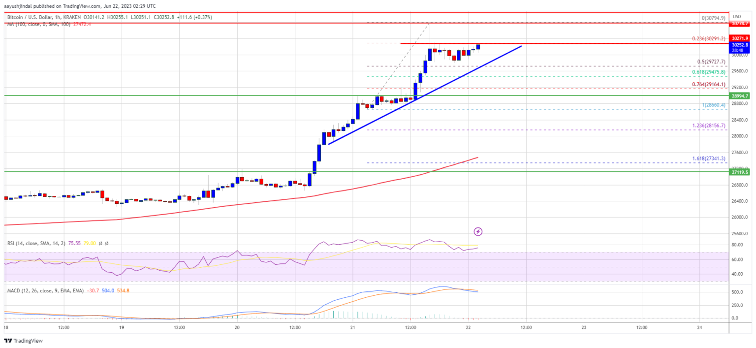 It traded close to $30,800. A high is formed near $30,794 and the price recently saw a minor downside correction. There was a move below the $30,500 level. The price dipped below the 23.6% Fib retracement level of the recent wave from the $28,660 swing low to the $30,794 high.