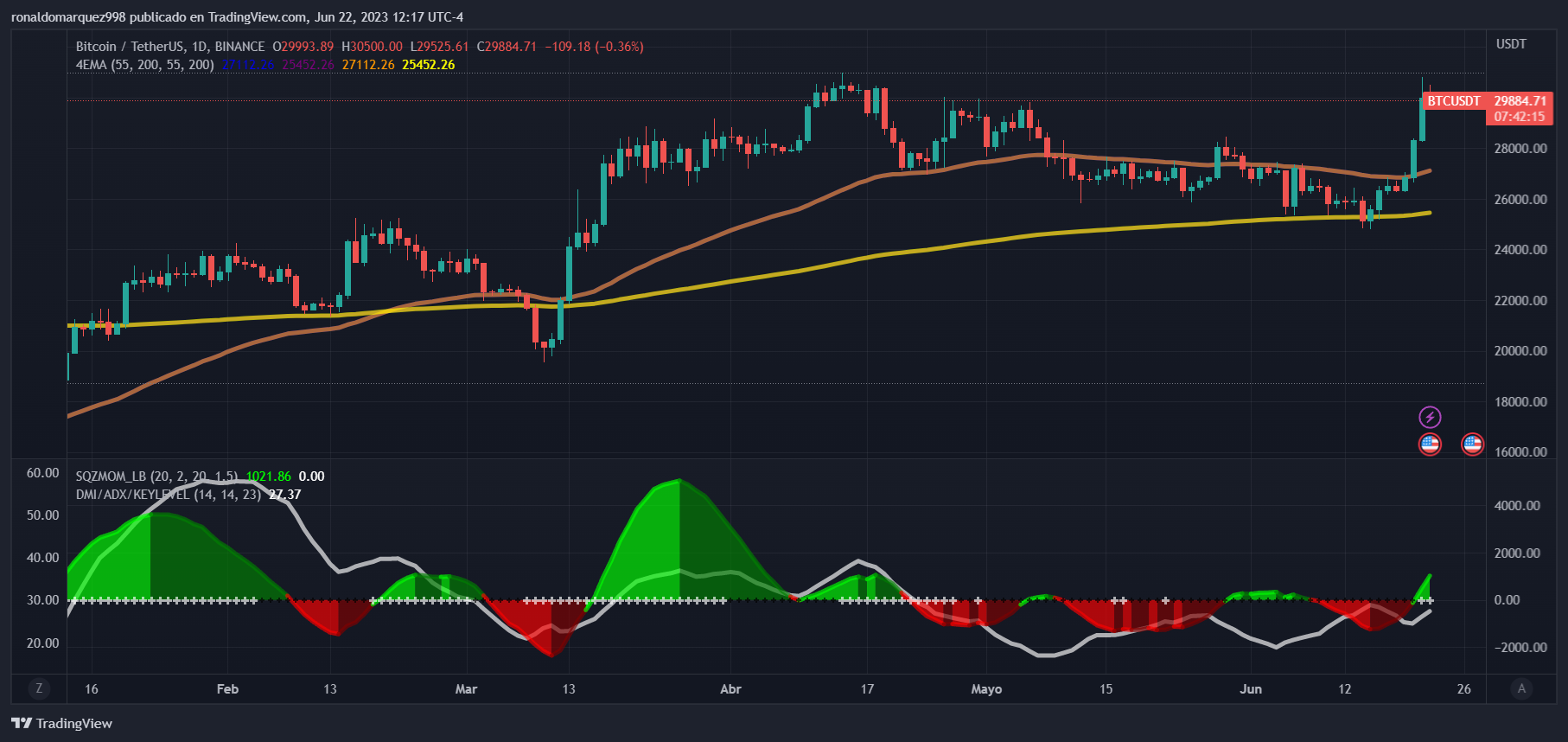 As of this writing, BTC is trading at $29,800, down by a slight 0.3% in the last 24 hours.