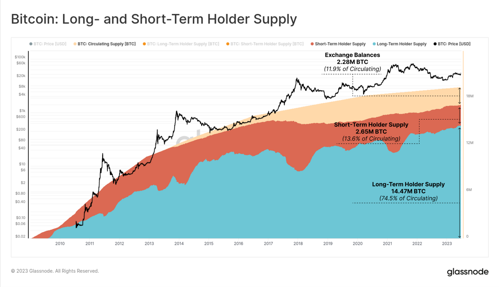 Currently, there is a continued transfer of wealth to HODLers, while more and more coins are being withdrawn from exchanges. According to Glassnode, there are currently only 2.28 million BTC left on exchanges (11.9% of circulating supply), a short term holder supply of 2.65 BTC (13.6% of circulating supply) while 14.47 BTC are held by long term holders (74.5% of circulating supply).