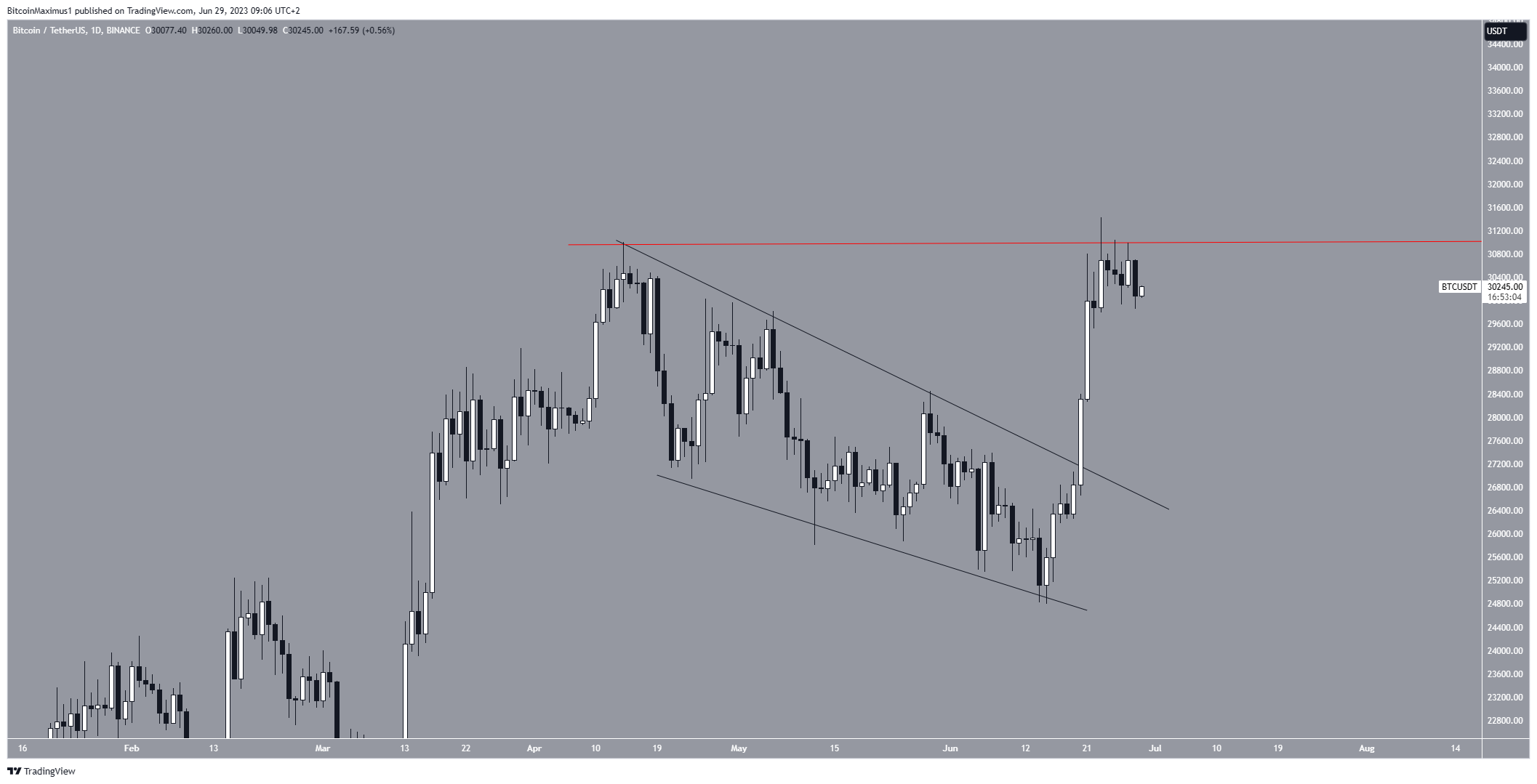 However, the BTC price smashed through the neckline without reacting to it whatsoever (red circle), reaching a new yearly high on June 23.