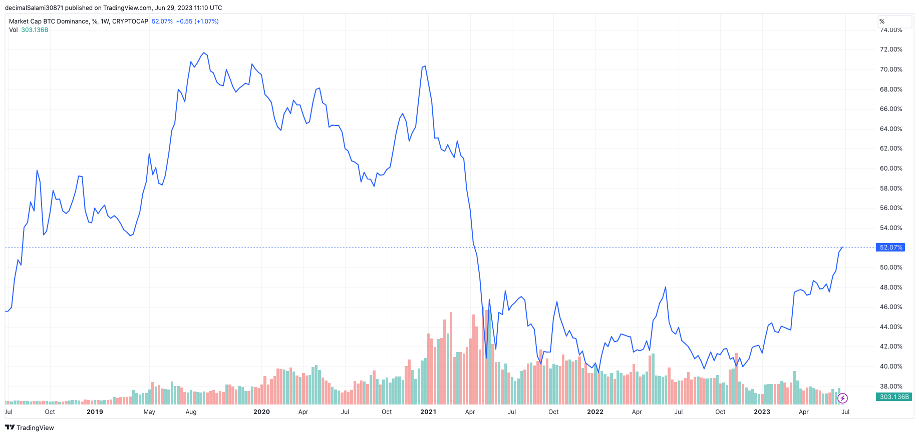 So, 2023 cannot match the scale of that drama. But there is something very intriguing happening to the market dynamics of Bitcoin, at least relative to other cryptocurrencies. Bitcoin dominance, which measures the ratio of the Bitcoin market cap to the cumulative market cap of all cryptocurrencies, is at its highest level in over two years, at 52%. In other words, 52% of the cryptocurrency market cap, currently at $1.18 trillion, is Bitcoin.