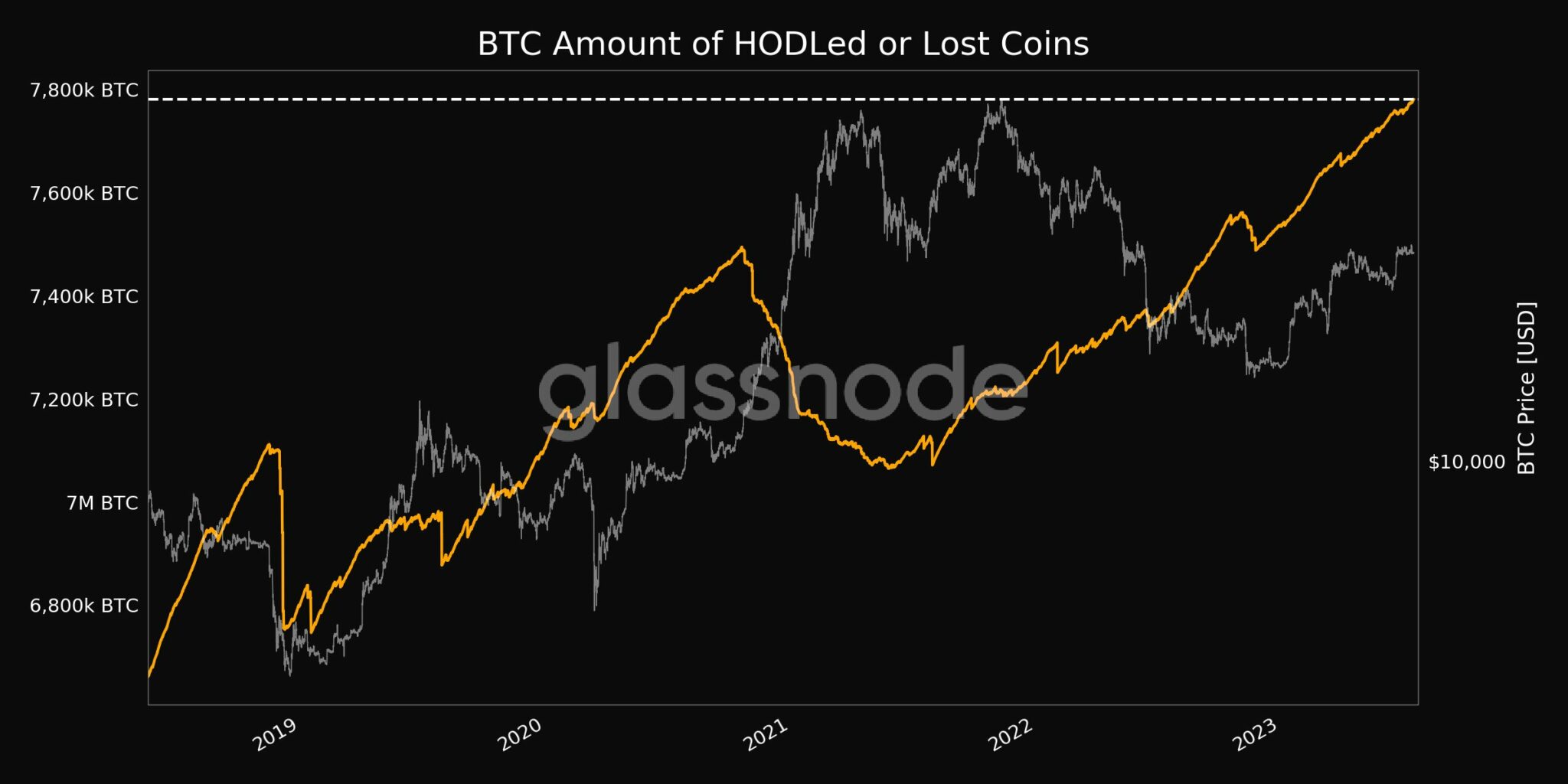 Similar data has been supplied by Glassnode Alerts, an on-chain metrics monitor. According to Glassnode, on-chain data shows that the total quantity of HODLed or lost bitcoins just hit a new all-time high of 7,781,224.168 BTC. Given that the price of a single Bitcoin is currently about $30,000, this equates to more than $235 billion in BTC that has now been lost.