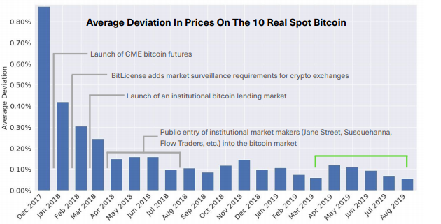 With perspective, one can see that the Bitcoin market has not been as efficient as it is now. Back in December 2017, when the price nearly touched $20,000, the price deviation was over 0.8 percent and this was among the top 10 real exchanges only, mind you. With time and the coming and going of the crypto-winter, that deviation has since subsided, with the price deviation over the entirety of 2018 being less than 0.2.