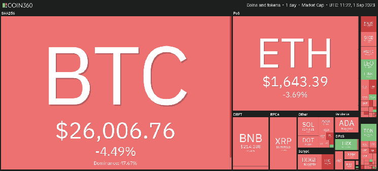 Cryptocurrencies were largely down on Friday, September 1 as major caps slid amid a surprising decline likely fueled by latest delays for spot Bitcoin ETFs.