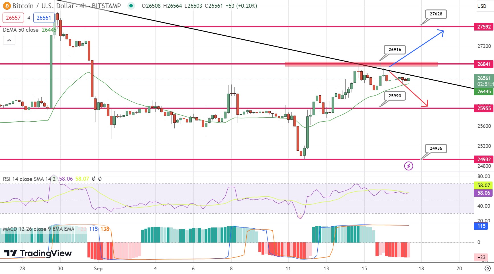 Investors should closely watch the $26,500 level, as it may serve as a key pivot point. Prices above this level could indicate buy signals, while prices below might hint at sell signals.