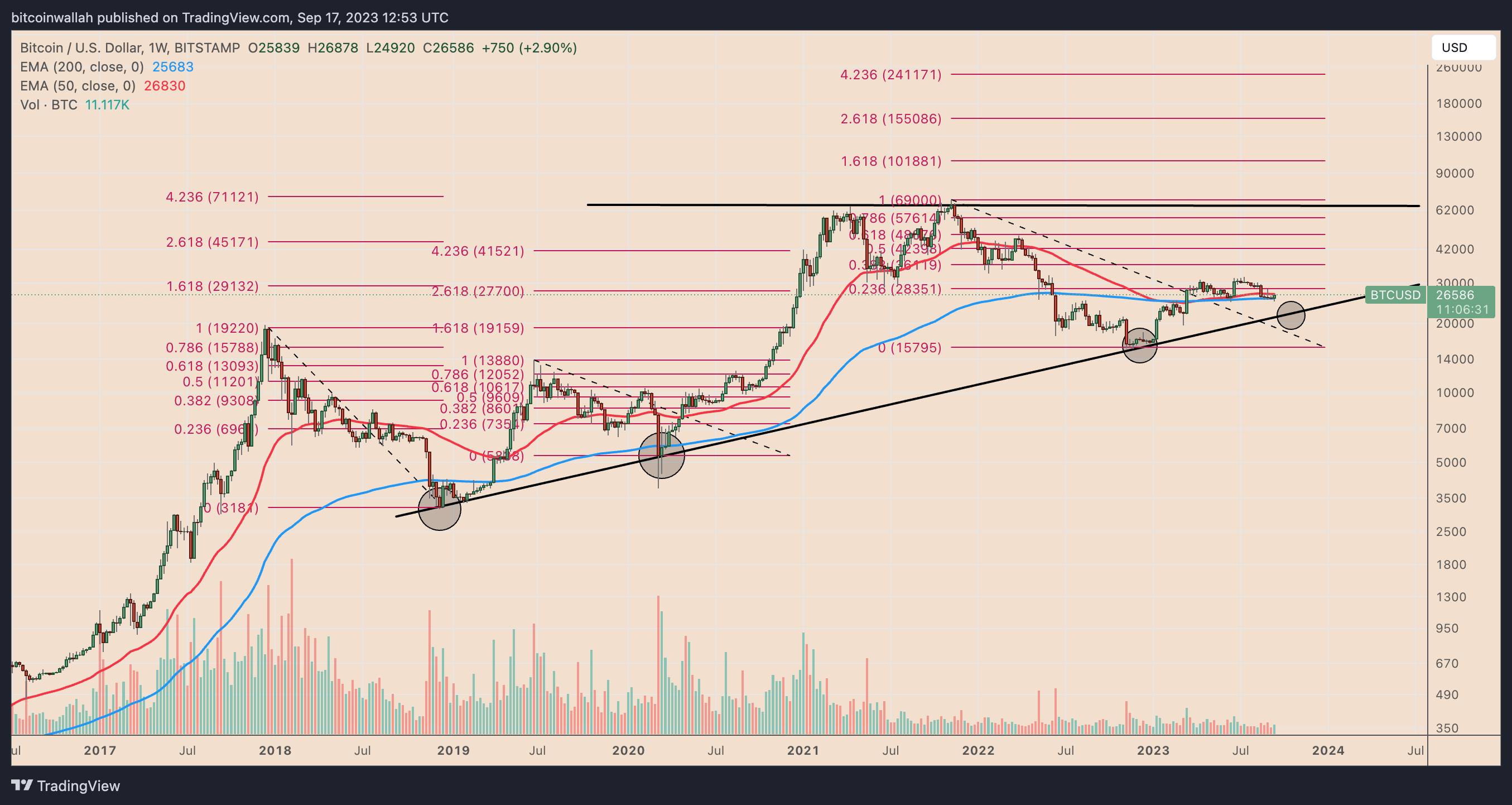 Bitcoin now treads below the 0.236 Fib line, raising possibilities of a retreat toward the bear market trendline support that's also near $23,000.
