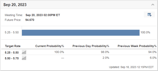 The Federal Open Market Committee (FOMC) is meeting this week and it is a safe bet that they will pause. They do not like to surprise the market, and the market is in universal agreement of no hike. The Fed Rate Monitor Tool on Investing.com is a good place to bookmark. It uses Fed Funds futures to imply what the market thinks.