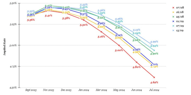 The curve is slowly moving higher, pricing in later and later cuts to the Fed Funds target range.