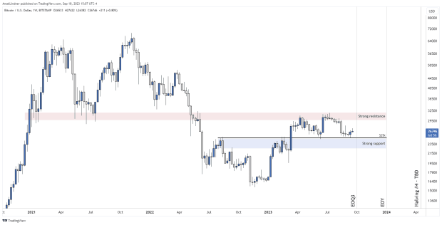 Bitcoin is stuck between strong support and resistance. Breaking out of this range, up or down, will be difficult, minus a surprise ETF approval. While we’ve been in this range for six months, fundamentals have continued to improve. For instance, the number of bitcoin addresses with >1 btc continues to grow, nearly 30% of bitcoin’s supply hasn’t moved in 5+ years, asset allocators with a total of >$17 trillion in assets under management have applied for bitcoin spot ETFs, bitcoin continues to come off exchanges, and the halving is coming. Price will eventually break the resistance and this range will then become massive support.