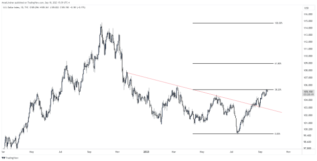 The dollar wrecking ball is threatening to come back. The dollar index (DXY) broke out of its downward trend in mid-August, back-tested and is currently rallying into the 38.2 fib retracement level. This is a strong move contrary to the almost universal bearish dollar thesis, but has now reached a logical place for consolidation.