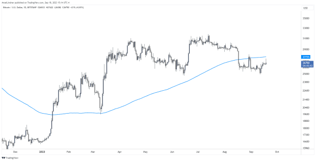 On the daily chart below, we see $25,000 held firm as resistance becomes support. This week price is attempting to break out from under the 200-day moving average.