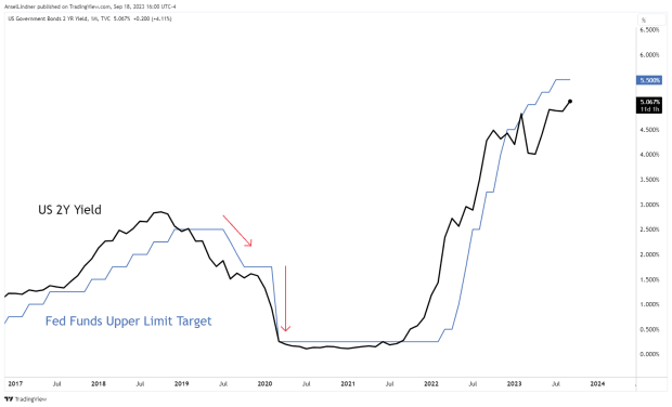 The Fed Fund futures curve has started to move upward for next year, meaning the market is pricing in fewer cuts, but not moving significantly higher on the short end. This tells us the market thinks the Fed is most likely done, and rate cuts will start sometime next year.