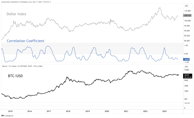 Typically, a strong dollar is seen as negative for bitcoin, but in bitcoin’s history the correlation coefficient with the Dollar Index (DXY) has been positive many times. In 2016, it even reached 0.93. In fact, prior to COVID, it could be argued, bitcoin and DXY were as often positively correlated as not.