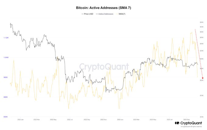 However, on-chain data reveals that Bitcoin is now far away from a bullish surge as its metrics turn bearish. CryptoQuant points out that one of the key factors behind this theory is declining price volatility. When observing the charts for Active Addresses (SMA 7) and Transaction Count (SMA 7), it becomes evident that there was a substantial increase in the number of Bitcoin ($BTC) deposits, withdrawals, and transactions in May of the current year due to the Ordinals. However, a notable decline occurred on September 19.