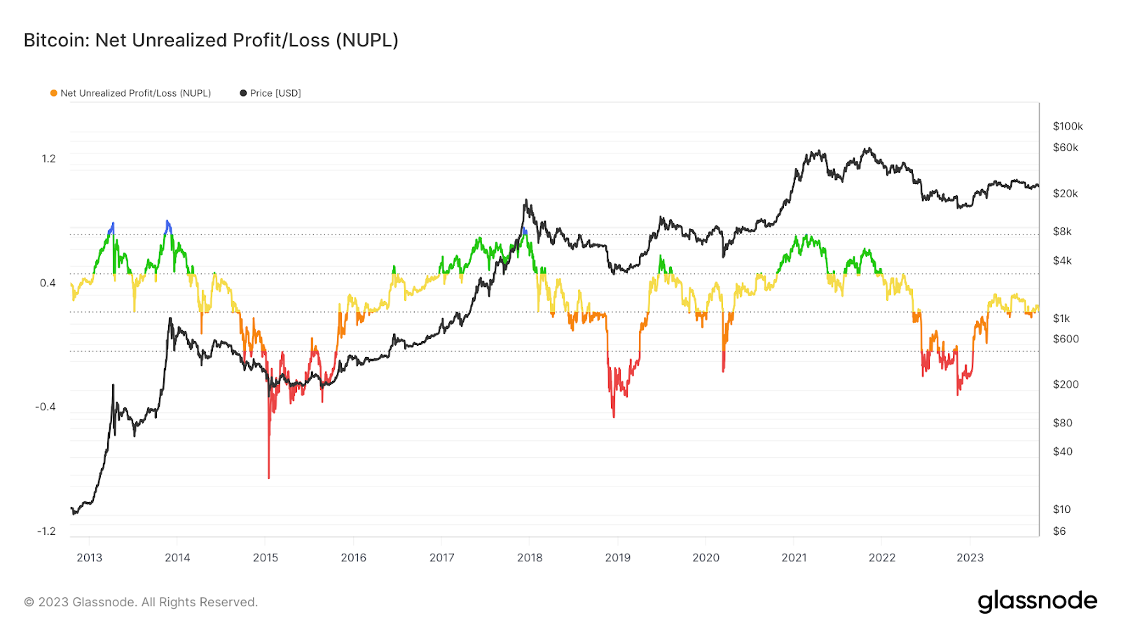 The NUPL chart contains five horizontal areas, which are interpreted from the market psychology perspective: from the red capitalization level to the blue area of euphoria and greed.