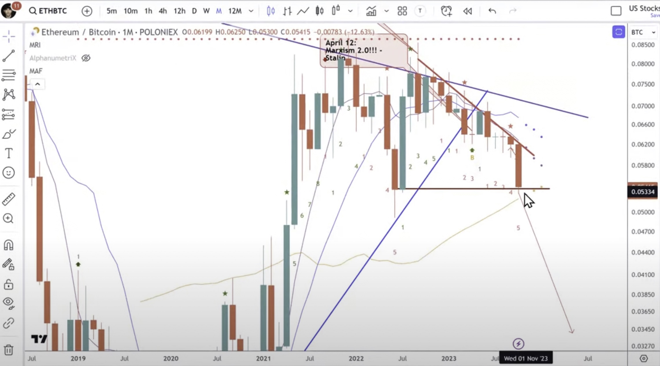 After Bitcoin, Vays first looked at Ethereum and noted that the altcoin king has formed a double bottom pattern against Bitcoin (ETH/BTC), but he does not expect this pattern to result in an uptrend. Although the double bottom pattern is typically seen as a bullish formation, the analyst does not expect it to serve as support for ETH/BTC and believes that the trading pair will move downwards.