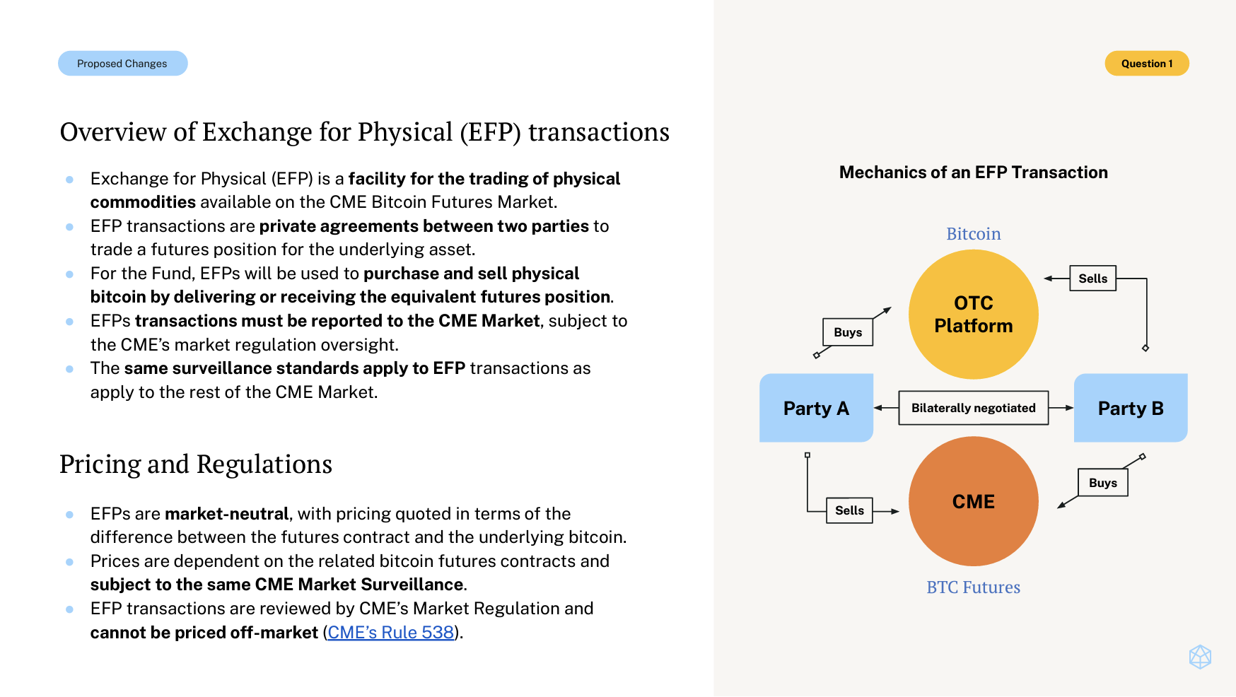 A presentation shared with SEC officials during this month’s meeting shows that the strategy is also built on the commission's Teucrium Order, which states that the Bitcoin futures market is sufficiently developed to support financial products seeking exposure to BTC.