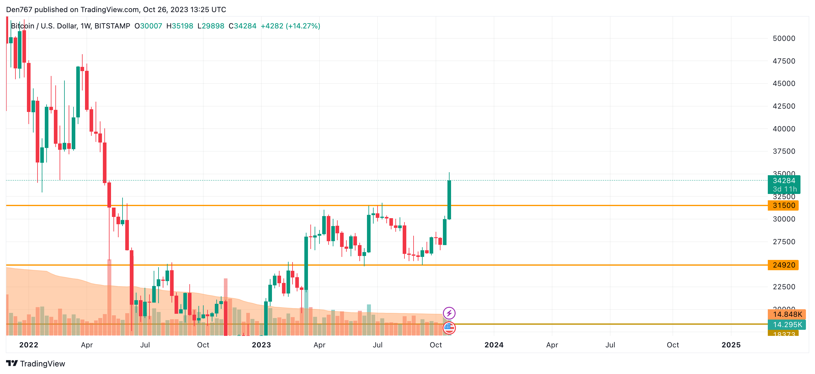 A more positive picture can be seen on the weekly time frame. If the bar closes near the $35,000 mark and with no long wick, the upward move is likely to continue to the $40,000 range next month.