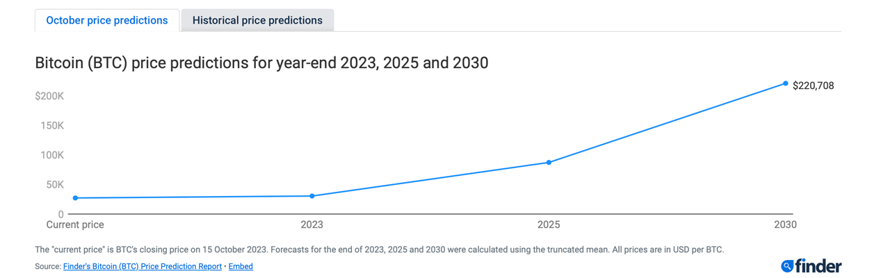 Bitcoin (BTC), the leading crypto asset by market cap, has captured considerable attention within the realm of digital currencies, demonstrating robustness and a pronounced market dominance. As it currently stands, its value hovers slightly beneath the $34,000 mark. The latest bitcoin price prediction report from finder.com sheds light on anticipated future developments, as construed by industry specialists.