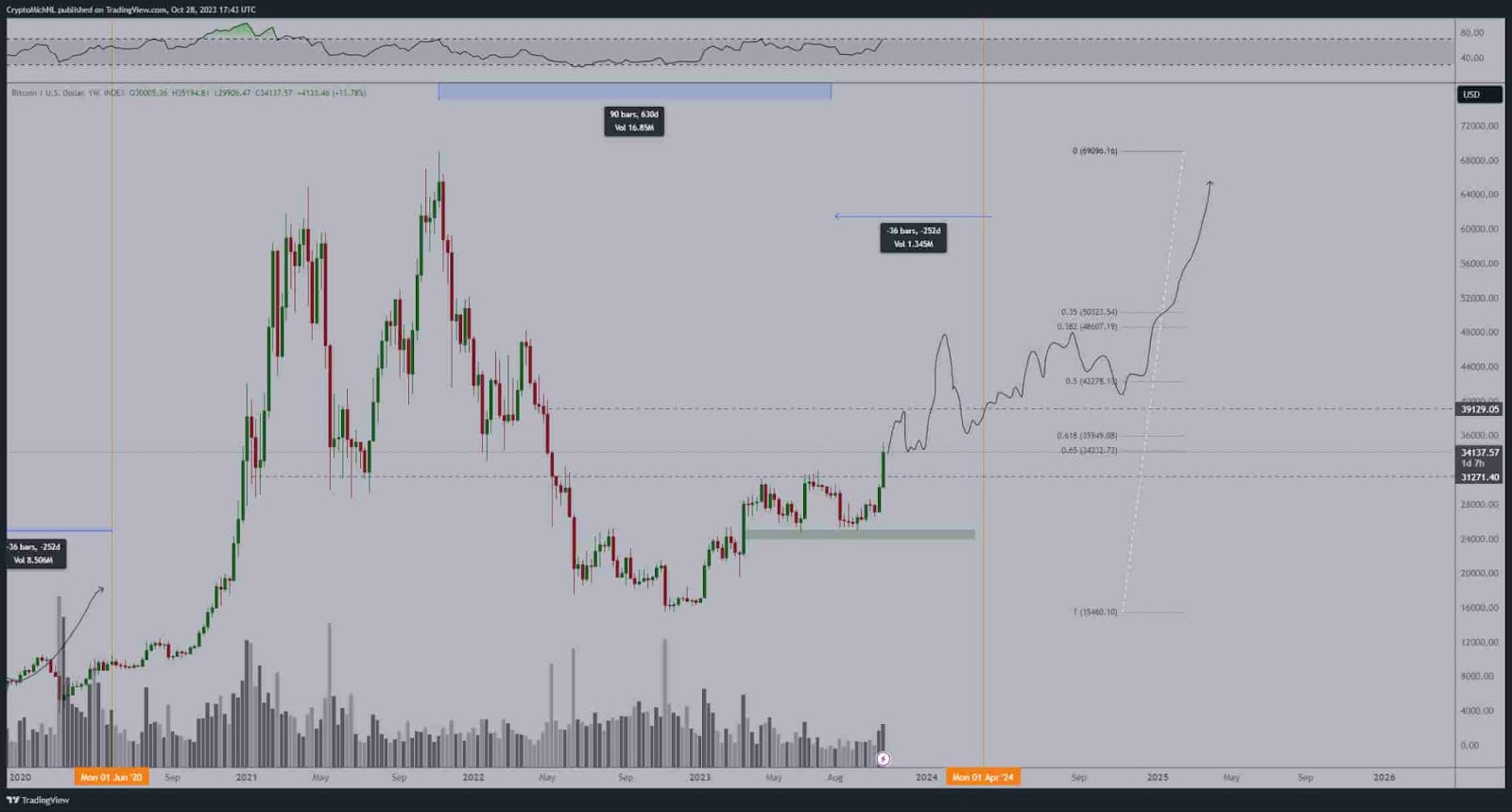 Among those offering insights is renowned crypto expert Michaël van de Poppe, who, on October 28, shared his thoughts on Bitcoin’s next major resistance, pre-halving price predictions, and the potential for new all-time highs (ATH).