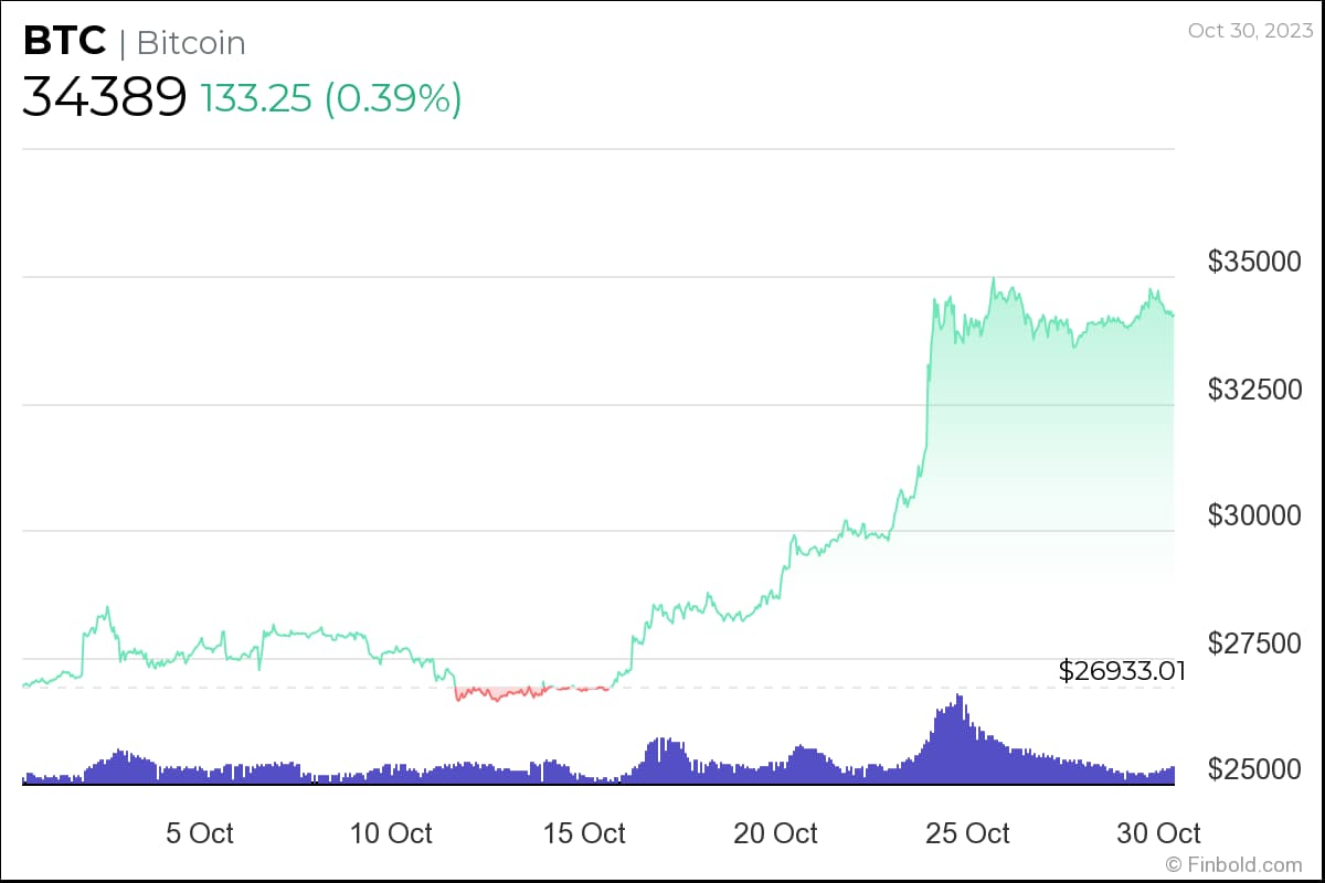 At press time on October 30, Bitcoin was changing hands at $34,389, up 0.39% in the past 24 hours.