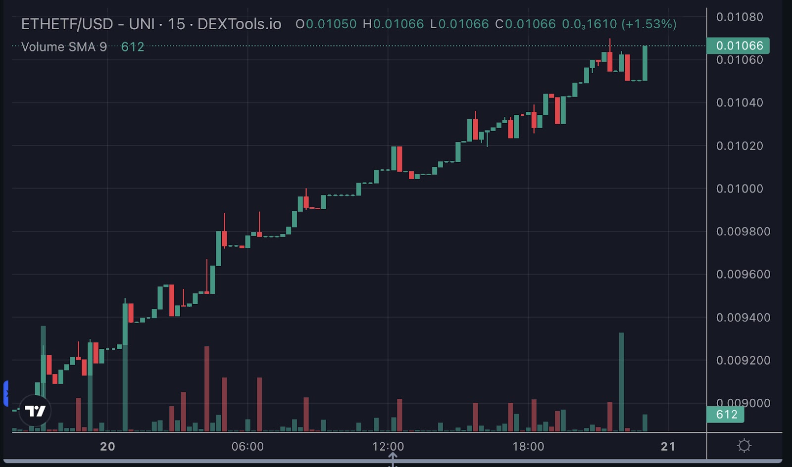 To celebrate a potential Ethereum ETF, the new ETHETF Token was launched on the Uniswap crypto exchange. The token has skyrocketed 15% over the past 24 hours with a market cap of close to $1 million, signifying the robust demand for such derivative tokens. The Dextools app has also given the project a score of 99.