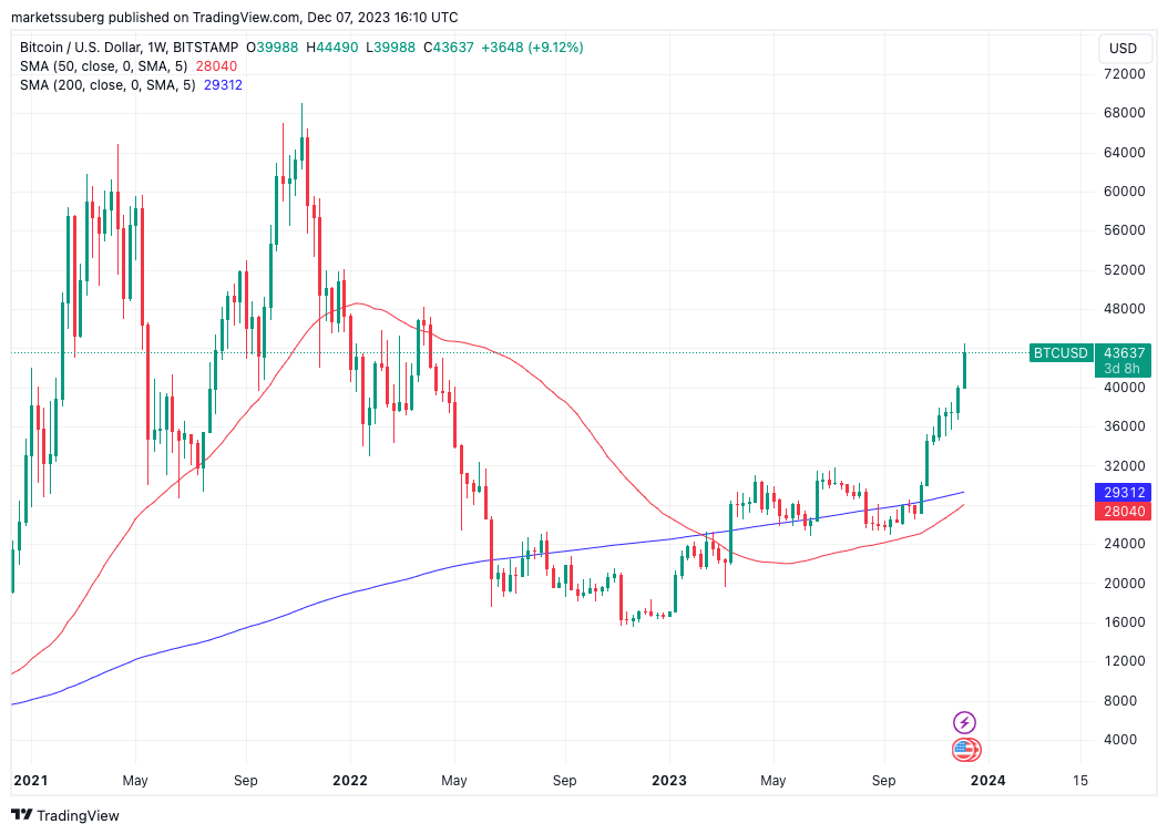 In a post on X (formerly Twitter) on Dec. 7, entrepreneur Alistair Milne drew attention to Bitcoin’s first ever weekly “golden cross.”