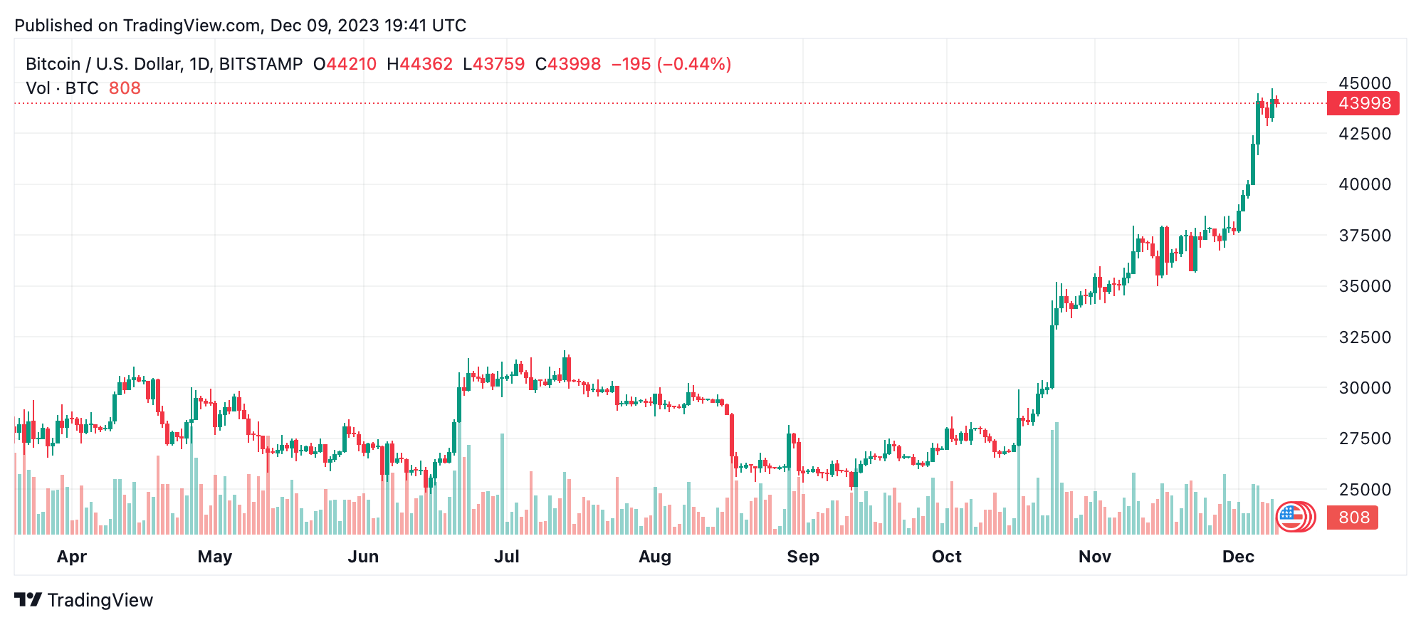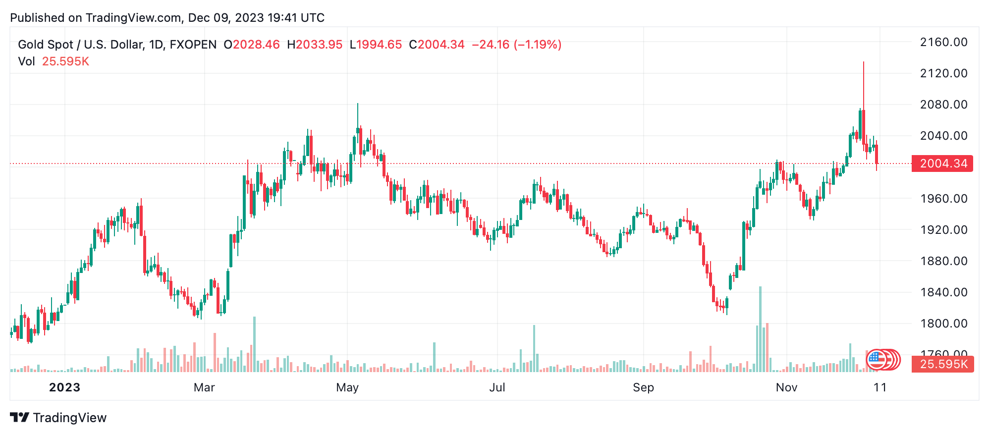 Gold achieved a record high of $2,117 per troy ounce on Dec. 3, 2023, yet its price per ounce has decreased by 5.33% in the previous week. Despite hitting this unprecedented peak, its year-to-date increase against the U.S. dollar is relatively modest at 9.9%. In contrast, bitcoin, the leading crypto asset in terms of market capitalization, has experienced a significant surge of 166% since the beginning of 2023.
