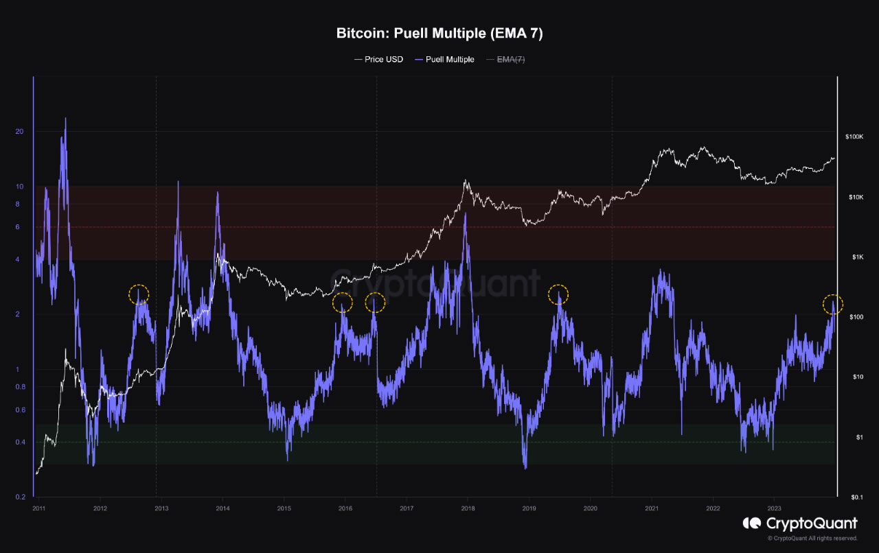 Analysts noted that they were seeing the Puell Multiple reaching values that were significant resistance in previous years. The technical indicator was notably present in 2012, 2016, and 2019, they added.