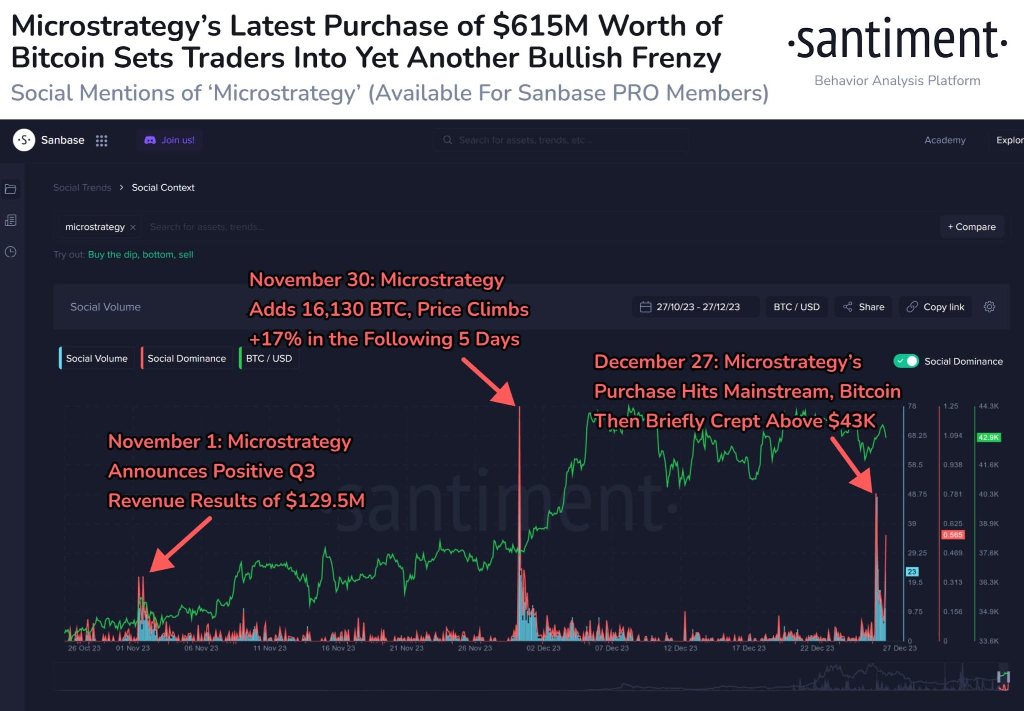 With a current holding surpassing $8 billion in the leading cryptocurrency, the company’s recent purchases and favorable developments have contributed to a bullish trend in the market, according to the cryptocurrency analytics platform Santiment post on December 28.