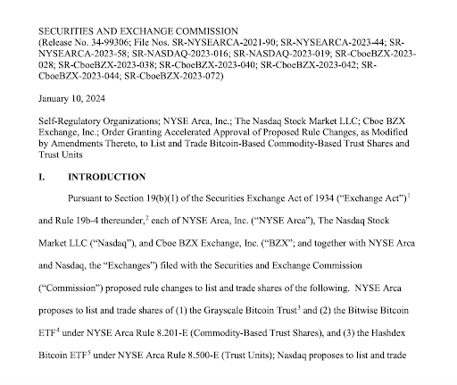 On January 10, the SEC approved the 19b-4 applications from various entities, including ARK 21Shares, Invesco Galaxy, VanEck, WisdomTree, Fidelity, Valkyrie, BlackRock, Grayscale, Bitwise, Hashdex, and Franklin Templeton. The approval involves rule changes enabling the listing and trading of spot Bitcoin ETFs on respective exchanges.