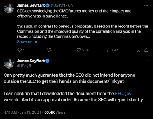 The ‘Error 404’ message, initially displayed on the SEC website after the approval, raised uncertainty about whether the document was intentionally pulled or a result of high site traffic. ETF analyst James Seyffart posted on X (formerly Twitter) that the commission may not have intended to release the approval document at the time it did but would likely repost it anyway.