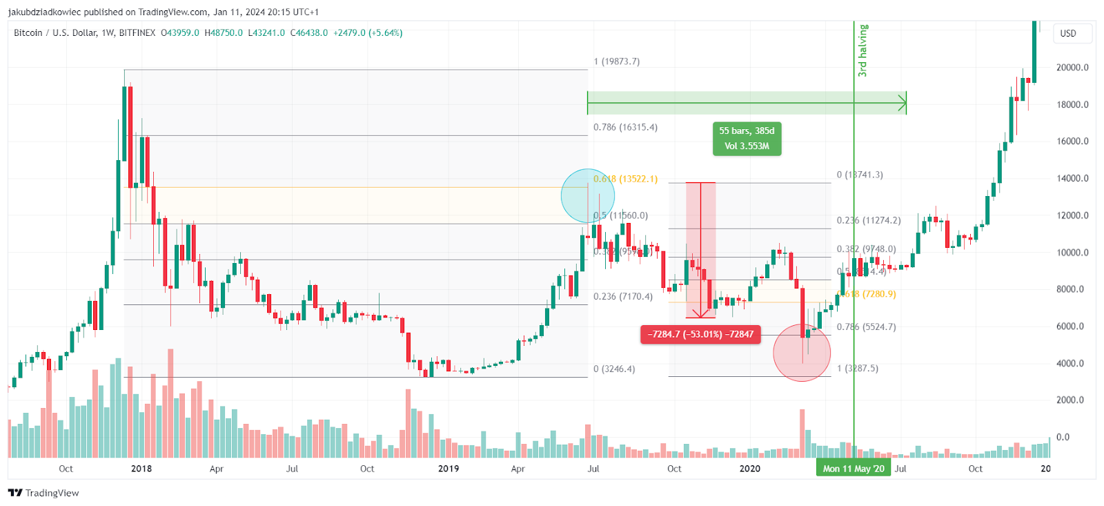 The current technical situation on Bitcoin’s long-term chart is very similar to that of 2019. Ongoing increases have also just led the BTC price to the gold pocket area and a local peak at $48,750 (blue circle). Interestingly, reaching this macro level coincides with the approval of the spot Bitcoin ETF.