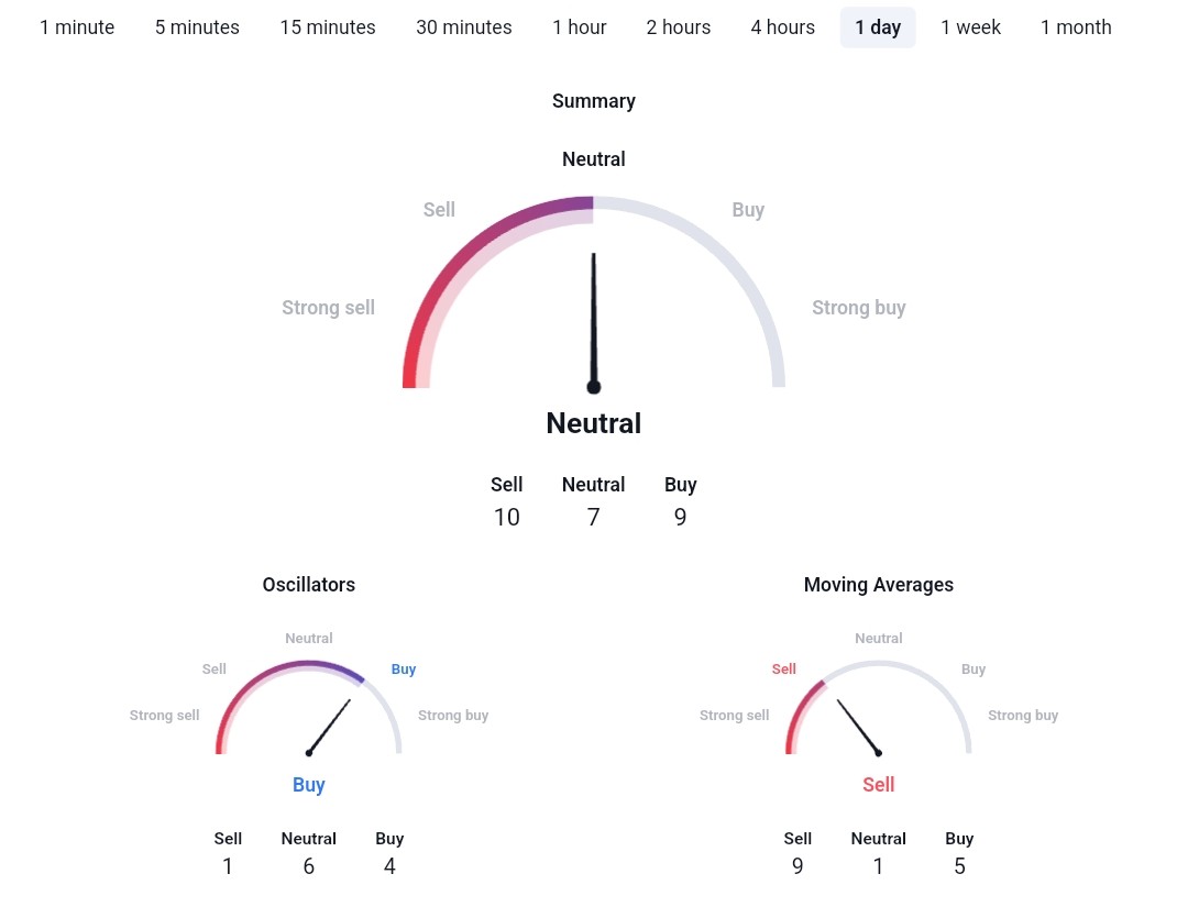 Elsewhere, Bitcoin technical analysis reveals bearish sentiments, with a summary of one-day gauges indicating a ‘neutral’ rating at 7, moving averages signaling a ‘sell’ sentiment at 9, and oscillators holding a ‘buy’ sentiment at 4.