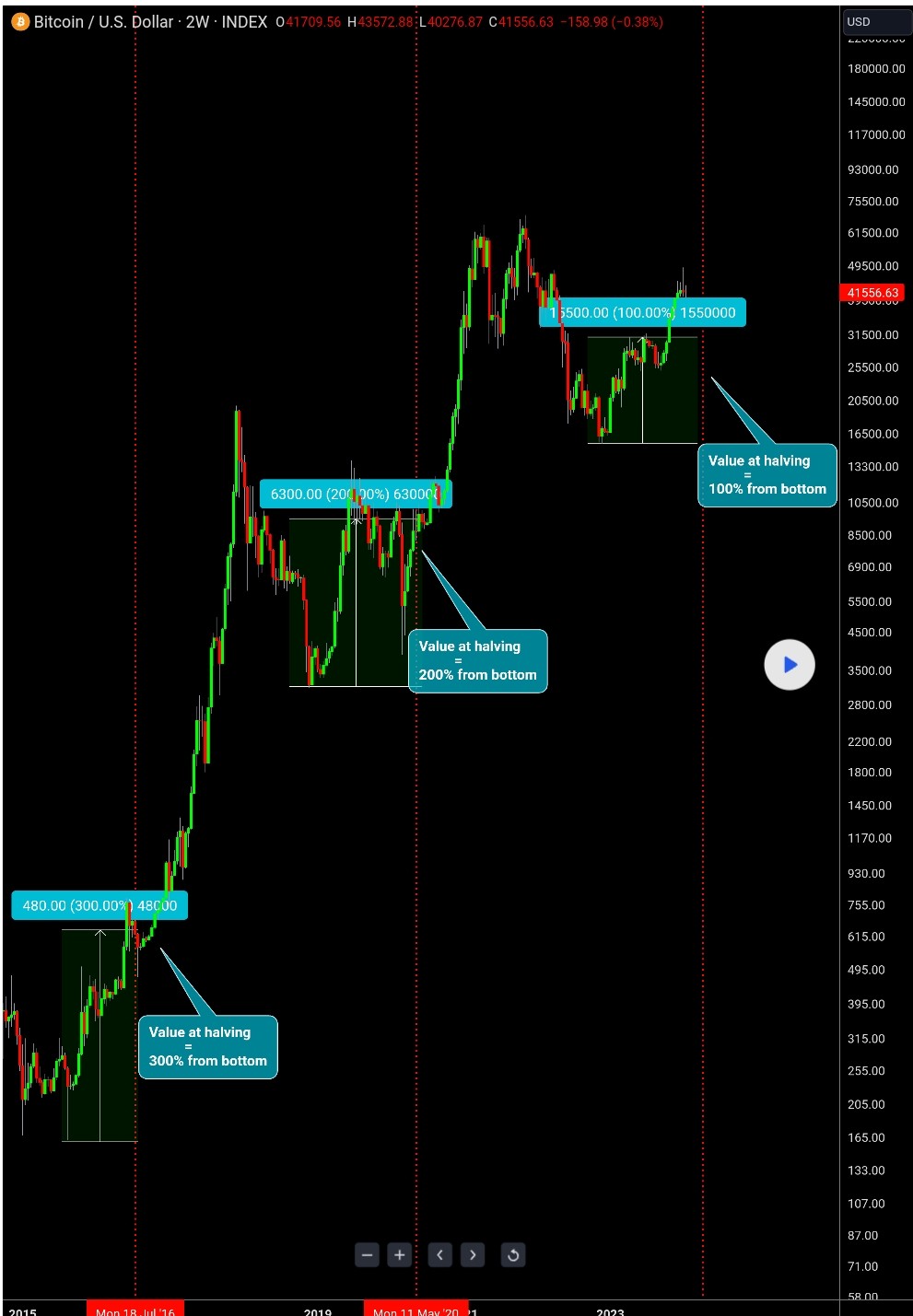 For example, during the second halving, the expert pointed out a price increase of 300% from the bottom, while in the third halving, it was 200% off the bottom.