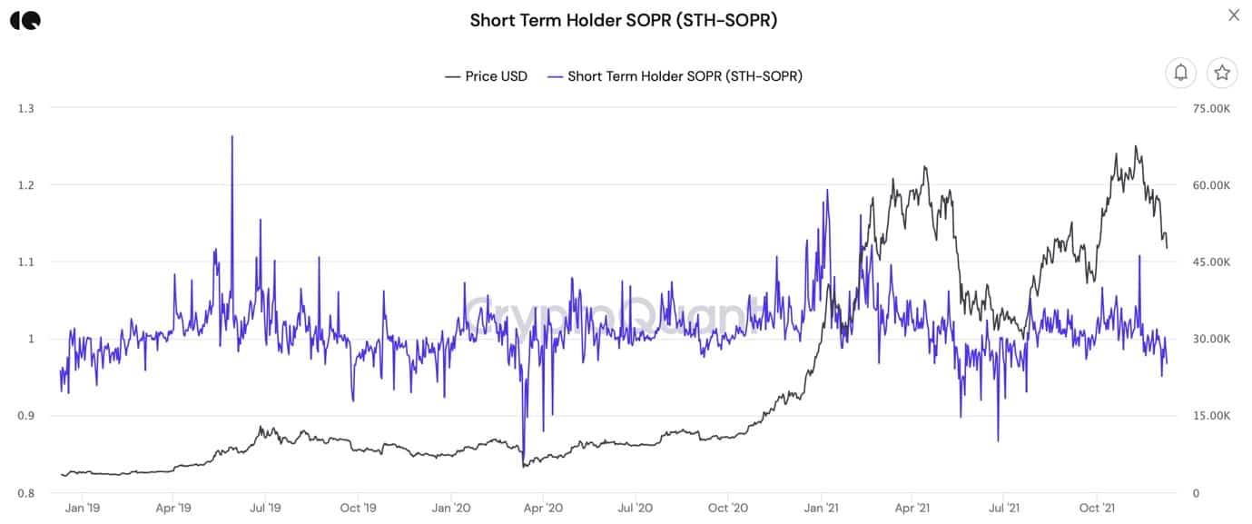 The short-term holder’s SOPR (Spend Output Profit Ratio, which estimates sell price ratio to last time a coin was moved or buy price), showing these investors are selling at a loss. This is a sign of fear for top buyers who tend to be sensitive about short-term volatilities.