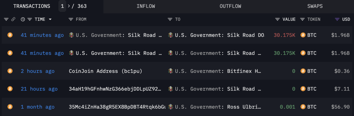 According to on-chain data, a 0.001 BTC test transaction, part of a larger stash of approximately 30,174 BTC worth $2 billion, was moved. The funds are linked to the infamous Silk Road marketplace was moved by the US government.