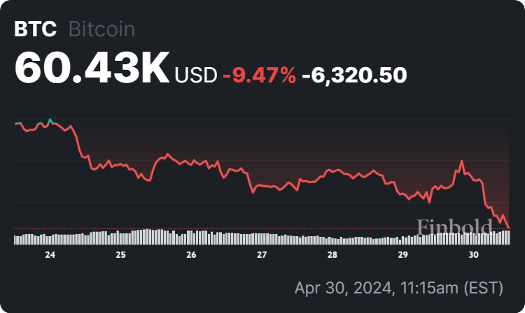 For now, the flagship decentralized finance (DeFi) asset is changing hands at the price of $60,430, which represents a 3.78% drop in the last 24 hours while losing 9.47% across the previous seven days, as well as declining 14.17% on its monthly chart, as per the latest data.